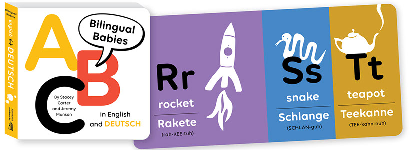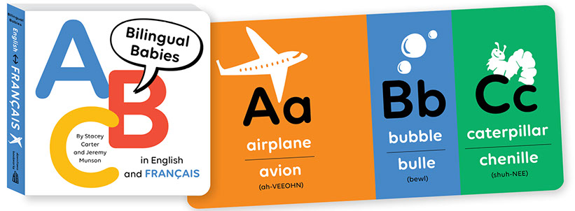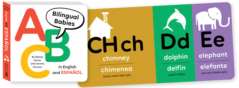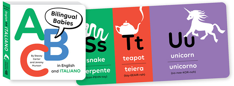 Each book includes simple, elegant illustrations for 26 A-to-Z child-friendly items, identified in English and a second language. Since the words in both languages begin with the same letter and share similar sounds, curious kids can double (or quadruple) up on early learning! Grownups can expand their language skills at the same time. Each foreign word includes phonetic pronunciation.