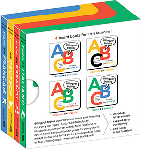This beautifully designed set of 4 concept board books teaches letter sounds AND foreign language—illustrating first words in English and Spanish, French, German, and Italian.