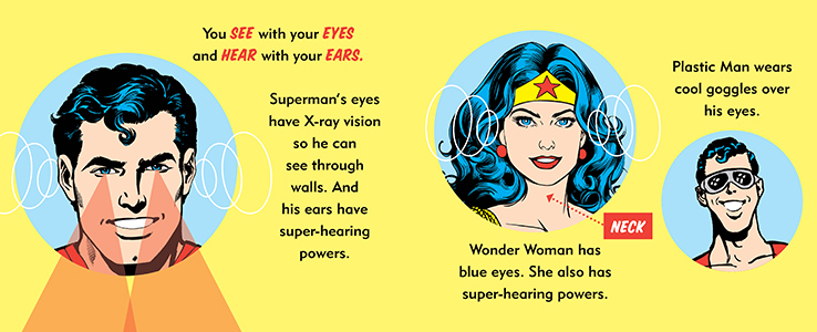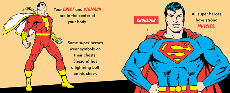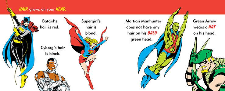 Fast legs, powerful muscles, eyes with X-ray vision, and bodies that bend and stretch—DC’s beloved super heroes have it all! In DC SUPER HEROES: BUSY BODIES, body parts are identified using fabulous retro illustrations. Readers also learn about actions, clothing, and super powers. Busy Bodies is part of a series of concept board books that includes: DC Super Heroes: ABC 123, Colors and Shapes, and Opposites.