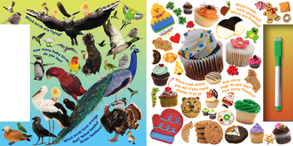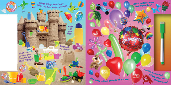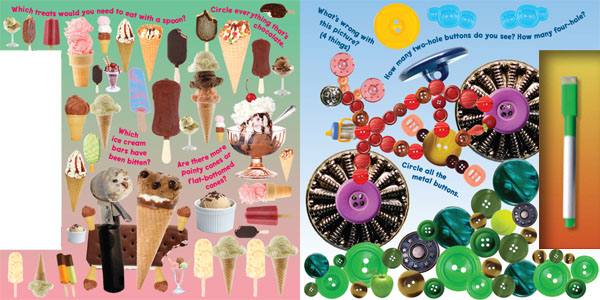 Each of the 24 pages in this wipe-off board book is a full-bleed, colorful, juicy, enticing photo collage which is actually a themed puzzle. From candy and ice cream to butterflies and flowers, each visual puzzle invites the puzzler to solve 3 or 4 entertaining challenges. They might be asked to find and compare items of different colors and shapes; identify things that don’t belong; locate items that begin with a particular letter, or things that share a characteristic, and more. The idea is that after completing each challenge with the enclosed dry-erase pen, they can erase their answers and start again with a fresh, clean picture. After they’ve completed all of the challenges listed, they are encouraged to create more…and more. So 24 fun-packed puzzles provide hundreds and hundreds of mind-bending challenges, and truly endless entertainment for kids 4 and up.