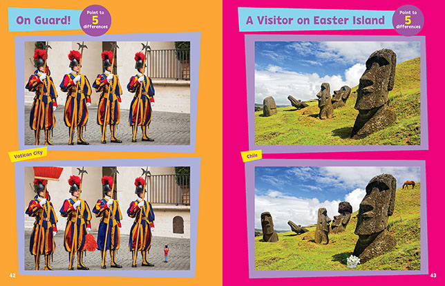 Fifty irresistible puzzles challenge children to focus, count, and compare pictures to find subtle (and hilarious) differences. Kids will be thoroughly engaged—and they’ll hone important skills while they play! In Around the World, check out kangaroos multiplying in Australia, tulips transforming in the Netherlands, hot air balloons popping up in Egypt, and more.